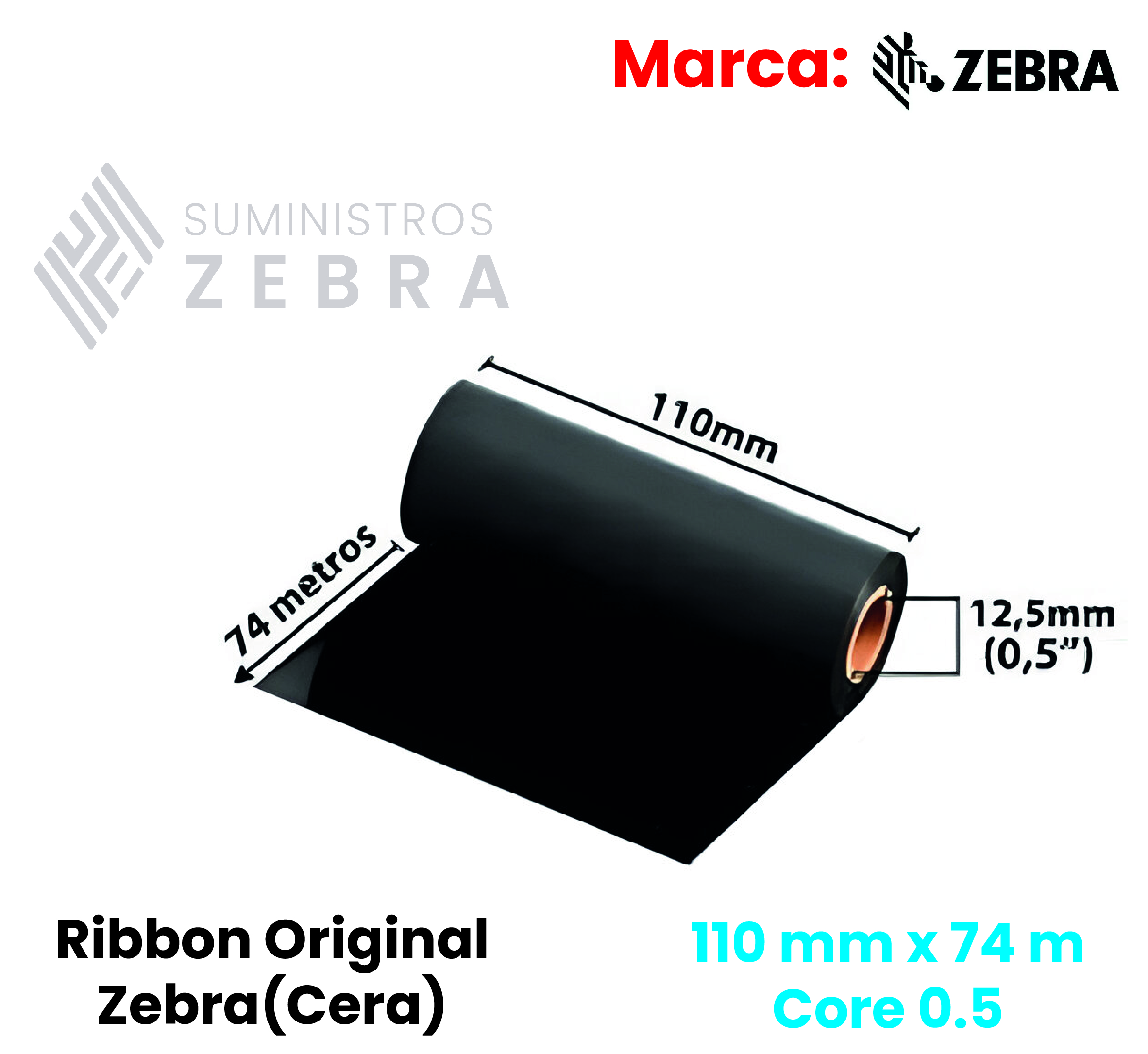Ribbon Original Zebra 110mm X 74m Cera, Core 0.5